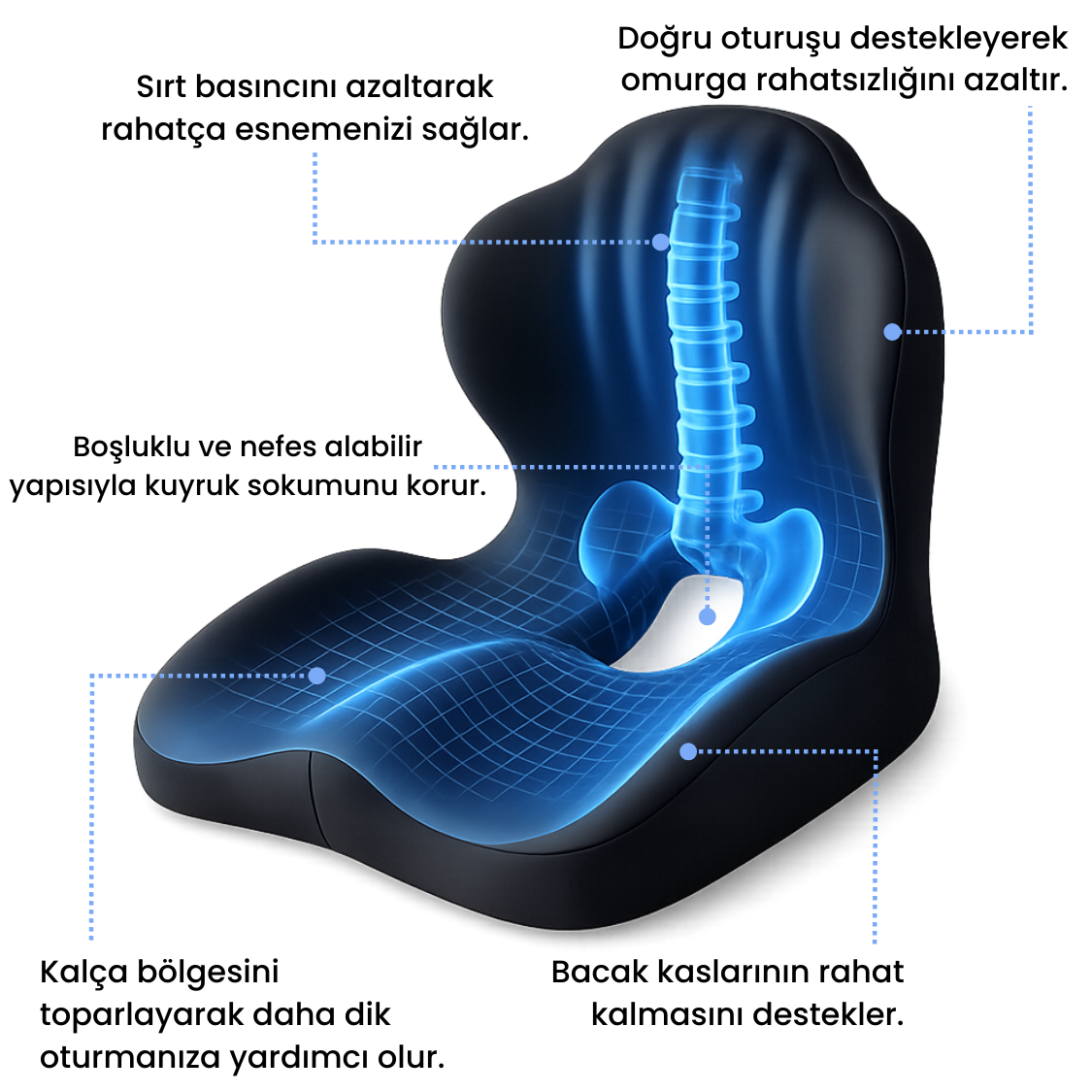 Gün boyu direksiyon başında ya da masa başında oturuyorsanız, bel ve kuyruk sokumu bölgesindeki baskıyı azaltmak artık çok daha kolay. Ortopedik tasarımı sayesinde vücut ağırlığını dengeli dağıtarak omurganın doğal duruşunu destekler ve daha konforlu bir oturuş sağlar. Uzun yol şoförlerinden ofis çalışanlarına kadar binlerce kişi, ilk kullanımdan itibaren daha az baskı ve daha rahat bir deneyim yaşadığını belirtiyor.
